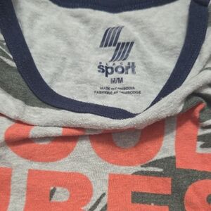 Set of two Old Navy tank tops. One is pink with gray trim. The other features gray with orange text and green palm design.