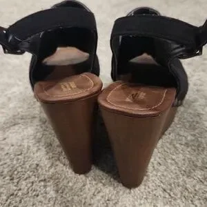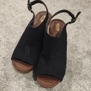 Chic black mules with peep-toe design. Comfortable slingback strap. Ideal for versatile styling.