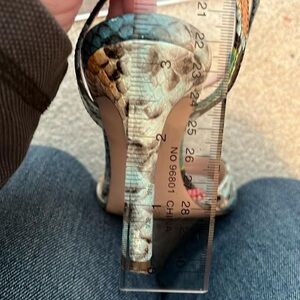 Add an edgy pop of colour to your outfit with these vibrant multicolour J. Crew snake embossed strappy heels. The heel height is perfect for day to night wear.