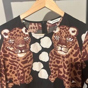 Stunning dress with print Kaksoset. A-line dress made out of cotton poplin, has pockets. Use as is or layer with a knit for colder days. Very good condition. Size 38 eur = size 6.