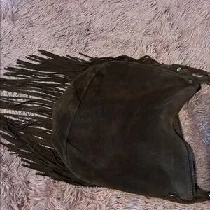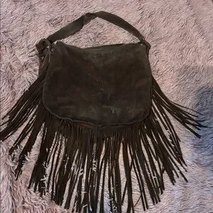 Stylish brown suede shoulder bag with fringe detailing. Perfect for a boho look.