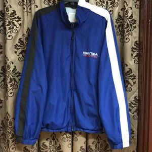 This is a very nice vintage Nautica windbreaker which features two tone sleeves of black and white, Nautica competition spell out on the front left side and has a big logo on the back. The Jacket has a few stains from age and a small rip on the cuffs of one of the sleeves other than that the jacket is in good condition.