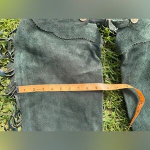 This is a pair of 1960s 70s vintage suede leather chaps in a deep forest green color with fringe running down the sides. They zip up the back of each leg with heavy brass zippers (one marked Scovill and the other marked with an “A”) and have an adjustable buckle closure at the waist. Likely handmade or small-shop produced, as was common in this era, and could have been used for rodeo, trail riding, or Western shows.