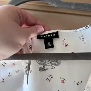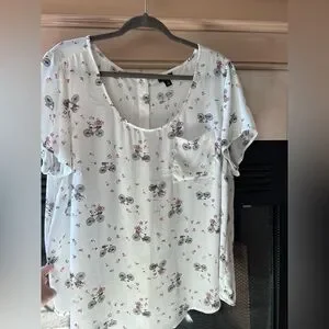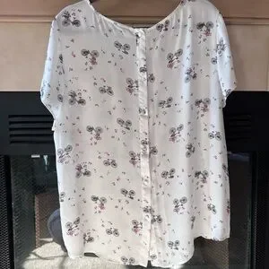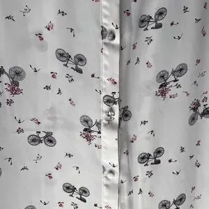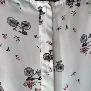 This elegant white blouse features a delightful bicycle print, perfect for adding a whimsical touch to your wardrobe. Ideal for casual outings or a relaxed day at work. Flowy fit, cutest fabric buttons down the back!
