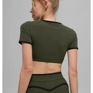 Chic short sleeve top by ALO Yoga. Olive with black accents.
