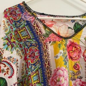 Vibrant floral blouse with intricate patterns. Features a mix of colors for a bold look. Lightweight and stylish.