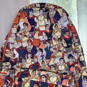 The Disney Store Oh My Disney Hero Prince Backpack Bag features characters from Disney's Prince franchise, including Flynn, Beast, and Eric. This large multicolor backpack is perfect for fans of Disney collectibles and showcases beloved characters from the Disney universe. Perfect for both children and adults, this bag adds a touch of magic to any outing or adventure.