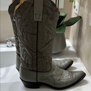 Elegant light gray boots with detailed stitching. Ideal for a Western style. These boots have alot of life left. 9D so great for a wide foot. Great boots great brand. All leather