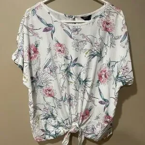 Chic floral blouse with tie front. Soft fabric with elegant floral design. Perfect for casual outings.
