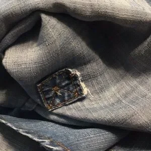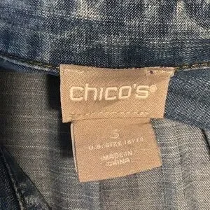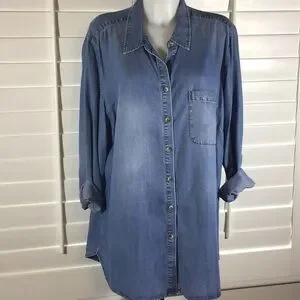 Lightweight chambray tunic is closet go-to for everyday wear. Button front, tunic length, pleat at back yoke, drapes nicely. The button tabs inside sleeves have been removed (see last pic) but sleeves are easily rolled without, and priced accordingly. Shoulder to hem measures prox 33”, across bust front 24”. Chico’s size 3 fits 16
