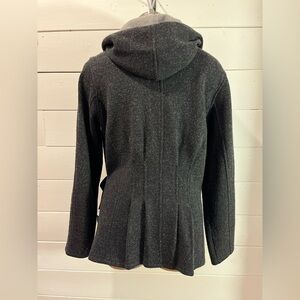 Wrap Wool Jacket – KÜHL (Size S) Beautiful and cozy wrap-style jacket from the outdoor brand KÜHL, made in 100% merino wool. This deep charcoal gray piece features a relaxed, open collar, a flattering wrap design with interior and exterior side ties, and a textured wool finish. Perfect for cooler days or mountain getaways. Magnifique veste portefeuille de la marque KÜHL, conçue en 100 % laine mérinos. Elle présente une couleur gris charbon foncé, une coupe croisée avec liens intérieurs et extérieurs, un col châle décontracté et une finition texturée en laine. Idéale pour les journées fraîches ou les escapades en montagne. Taille S. Hashtags #Kuhl #WoolWrapJacket #MerinoWool #VesteMérinos #OutdoorStyle #LayeringLook #ApresSki #CharcoalGrey #SlowFashion