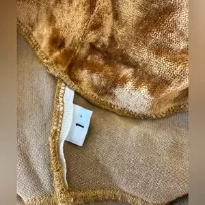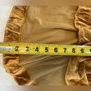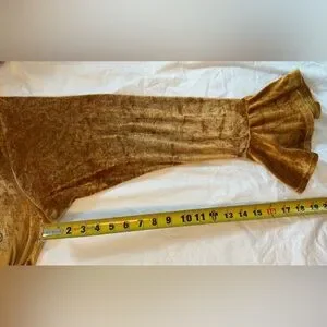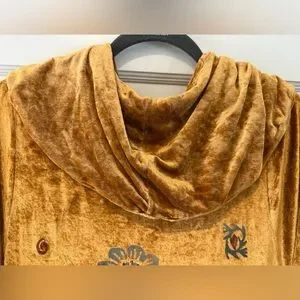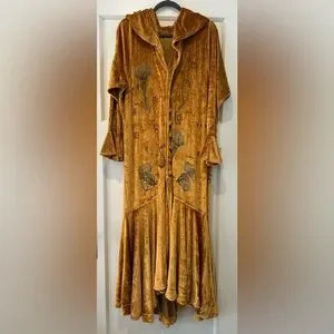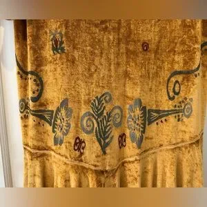 Gorgeous and dramatic golden velvet coat with beautiful hand painted designs all over. A fitted coat with stretch in the fabric. Generous shawl collar, velvet covered buttons, and a full skirted bottom that dips about 8 inches in the back. Rayon, Nylon and Lycra blend. See photos for measurements as this is a slimmer fit than most BF pieces. Feel free to contact me if you have more questions!