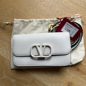 *SOLD* Chic Valentino crossbody in sleek white. Features signature logo detail. Perfect for any occasion.