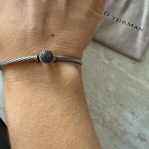 Sophisticated womens bracelet with a the classic David Yurman cable design with genuine black diamond accent. Crafted in silver for a timeless look. Sold with original pouch.