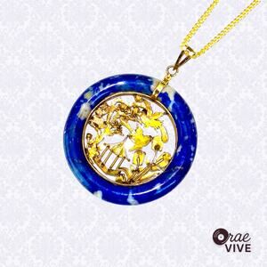 The pendant is adorned with a vibrant combination of natural gemstones. The rich, deep blue of the Lapis Lazuli provides a striking contrast to the luminous Opal, known for its unique iridescent play-of-color. The intricate gold setting highlights the beauty of the stones and the craftsmanship of the piece.