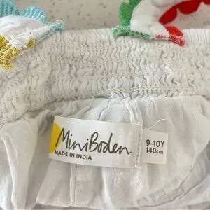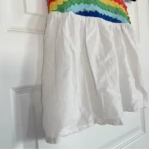 Vibrant rainbow scalloper crochet stripes on top. Soft white fabric below. double lined. cotton. Perfect for playful days. minimal signs of wear visible. no damage. no stains.