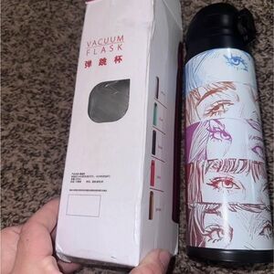 Stylish water bottle with artistic eye designs. Features a secure black lid. Perfect for daily use.