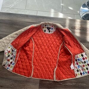 Lands End diamond quilted tan jacket with contrasting red lining. Snap closed pockets. Two snap open back vents. Please see all the pictures for measurements and condition.
