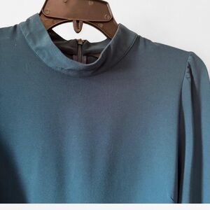 teal midi, lined dress, metal back zipper, vintage style, elegant midi, long sleeve dress, modern classic, satin finish, sophisticated, 90s inspired