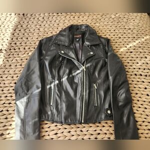 Chic black leather jacket with sleek silver zippers. Ideal for a modern look. In great condition