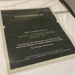 Elegant sheet set featuring a crisp white design with a bold grey border. 100% sateen, 600 thread count. Fitted sheet, full sheet and 4 pillow cases included. Ideal for adding a touch of sophistication to any bedroom.