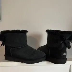 UGG Mini Bailey Bow II Water Resistant Bootie. Cozy black shearling ankle boot with a stylish bow detail. Perfect for cold weather. Black.