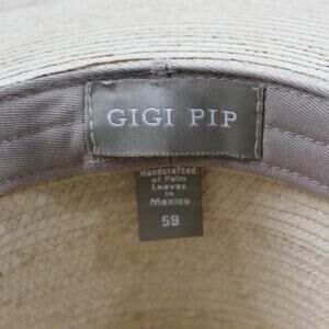 Features: Teardrop crown, wide flat brim, leather chin strap with grommeted eyelets, metal GIGI PIP badge, interior sweatband