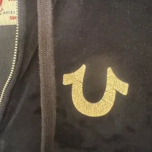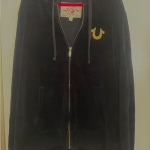 EUC Mens True Religion Black Velvet Zip Up Jacket Gold Logo Hoodie Size 3XL