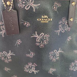 SMOKE-FREE HOME PRE-OWNED CONDITION ** Please see pictures for blemishes on handles. Part of the handles have frayed from normal wear as well as unglued in a few sections, but does not take away the functionality of the bag. Printed coated canvas and smooth leather Reversible Style No. F78283 Coach, preowned - crafted from printed coated canvas and smooth leather, featuring a reversible design, giving you two distinct looks in one bag. The handles offer a 9 1/2" drop, and it measures approximately 13" (L) x 11 1/2" (H) x 6 1/4" (W). Print Details: The "Ribbon Bouquet Print" showcases elegant ribbon-like floral patterns, often in black, pink, and multi-color combinations. ** Please see pictures for blemishes on bag.