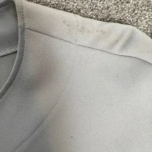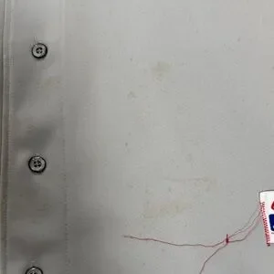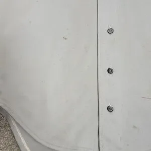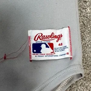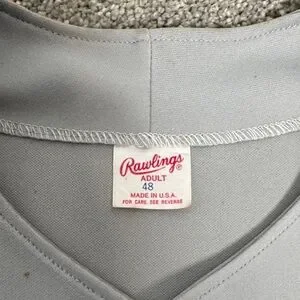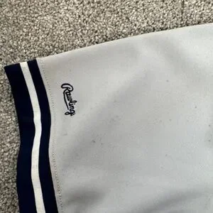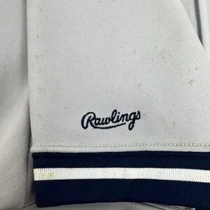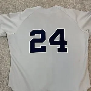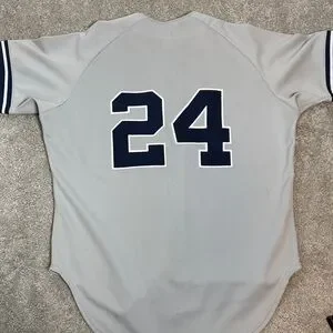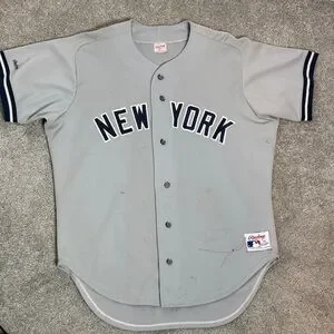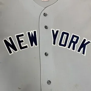 Gray jersey with 'New York' text. Features dark blue trim. Button-up front.