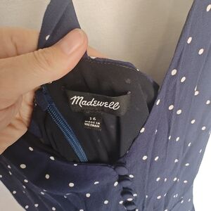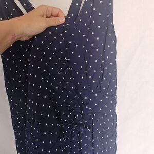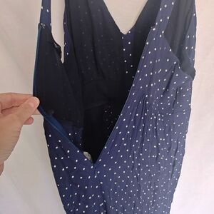 Chic and stylish navy jumpsuit with playful polka dots. Perfect for any occasion.