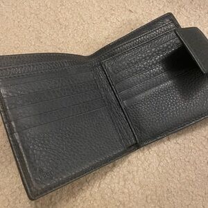 Gucci Horsebit wallet. Coin compartment on one side with minor residue and cards and bill compartment on the other. 10 card slots and 2 bill compartments. Minor cracking in the middle where the wallet folds. See all photos. Great condition. Will include COA.