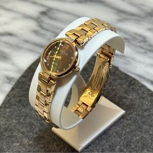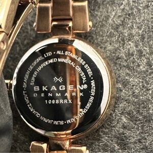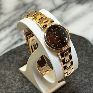 Open to offers! Skagen Denmark has Danish design. This one is a beautiful example. It has a gold tone with crystals accenting the hour markers on the face and the top and bottom of the bezel. The face itself is a gorgeous brown that compliments the gold. It is said that the company symbolizes the meeting of the Skagerrak and the Kattegat bodies of sea water at Skagen in Denmark. I think the iridescent swirls in the face bring that to life. This fits up to a 7.25 inch wrist. I can work with you to adjust the size before shipping for free if needed.