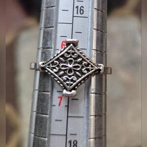 This elegant silver coated filigree ring adds a touch of sophistication to any outfit. Perfect for any occasion.