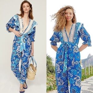 Get into a flowerful state of mind to bloom all season long. This linen blend jumpsuit brings a cozy-yet-fresh silhouette, flaunting a plunging v-neckline and gorgeous ruffled detailing. This straight-leg style is finished with a self-tie cinched waist. A bold, vibrant cobalt mixed floral paisley print is contrasted by delicate ivory lace and Broderie Anglaise eyelet trim.