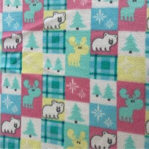 Soft Fleece baby blanket with polar bears, moose, trees, and star designs. Features pink, yellow, and teal squares with white.