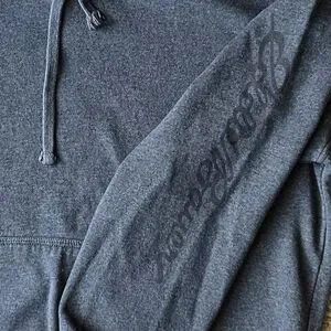 Classic gray hoodie with a white logo on the sleeve. Ideal for casual wear.