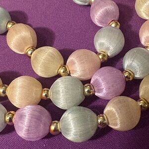 Beautiful vintage (circa 1950s-60s) pastel colored silk thread beads alternating with small gold-tone beads. Silk beads are plastic beads wrapped in satin silk thread. Necklace is a continuous strand (no clasp). Silk thread beads measure 7/16” (10mm) in diameter. Necklace measures 32” long. Excellent vintage condition…looks like it has rarely, if ever, been worn.