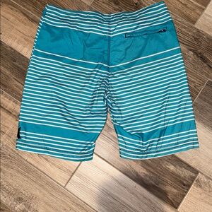 Black and blue board shorts with striped pattern. Comfortable fit. In excellent condition only one small sign of wear, which is on back pocket as pictured size large.