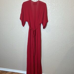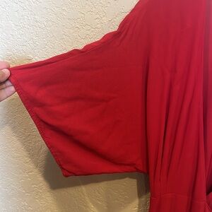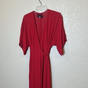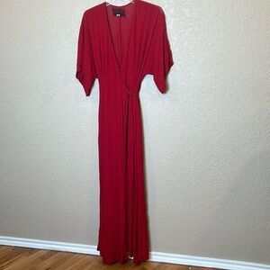 Elegant red maxi dress. Features a wrap design. Flowy silhouette with a side slit. Perfect for any occasion. Never wore has been dry cleaned.