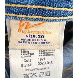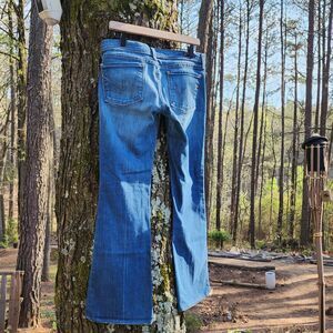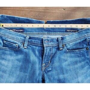 Pre-owned Citizens of Humanity jeans in size 30, featuring a low waist and flare fit in a solid blue denim color. In great condition with no noticeable flaws. Made from a cotton blend with added stretch, these regular fit jeans have a zip closure and a medium fabric wash.