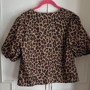 Chic animal print top with tie-front. Features puff sleeves.
