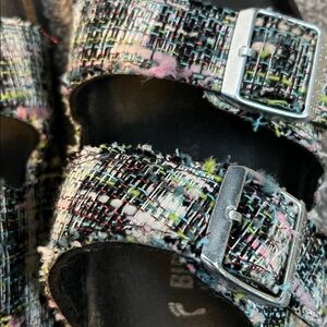 Chic Birkenstock sandals with a black base and multicolor tweed design. Features comfortable double straps. Hardly worn, excellent condition.