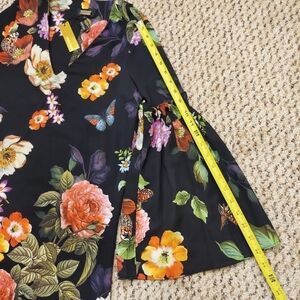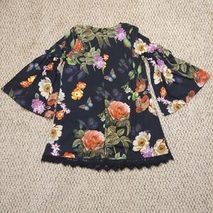 Gorgeous dress, brand new with tags. Semi-sheer, dark floral with fun bell sleeves. Lacy trim around the hem.