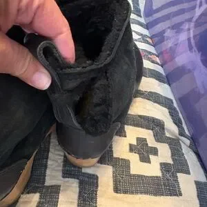 Stylish black leather ankle boots featuring a cozy lining and wooden heel. Perfect for a chic look. No.6 well loved shearling clog bootie. They have a rip in the back as shown in pics.