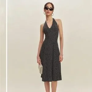 Chic black midi dress with white polka dots. Halter neckline. Perfect for any occasion. Worn once