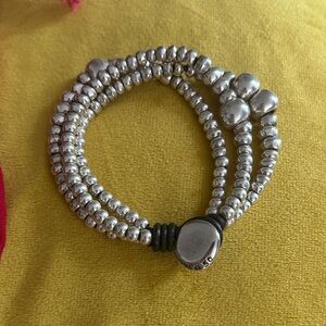 Elegant silver beaded bracelet with a red drawstring pouch. Perfect for adding a touch of sophistication.