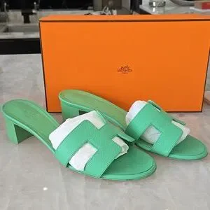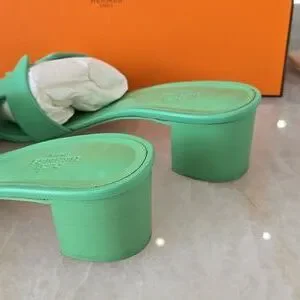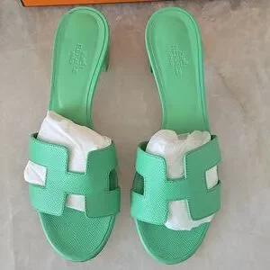 HERMES Epsom Oasis Sandals in Malachite. These stylish slippers are crafted in stamped light green leather with insoles of light green leather and a stacked green wooden heel. The toe strap is a cross-over large Hermes H.