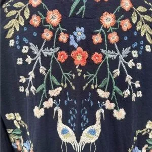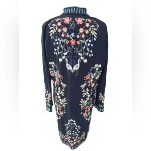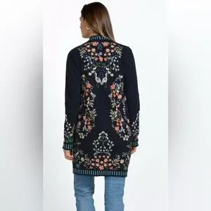Johnny Was navy sweater cardigan features intricate floral embroidery. Pockets. Approx 38” long. 22” pit to pit. Excellent condition. Worn once or twice.