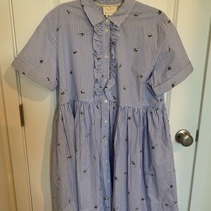 Chic striped shirt dress with bumblebees. Features ruffle accents and button front. Ideal for versatile styling.
